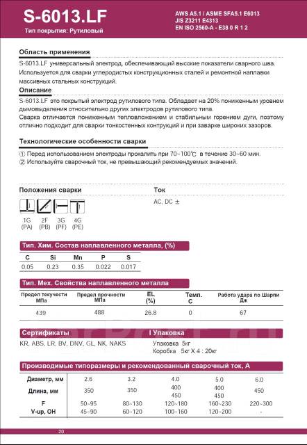 Характеристики электродов: При сварке электроды S-6013.LF выделяют на 20% меньше дыма, чем другие электроды с аналогичным покрытием, и обеспечивают отличное качество сварки во всех пространственных положениях. Электроды S-6013.LF обладают высокой стабильностью горения дуги, легким отделением шлаковой корки, красивым (гладким) внешним видом шва.